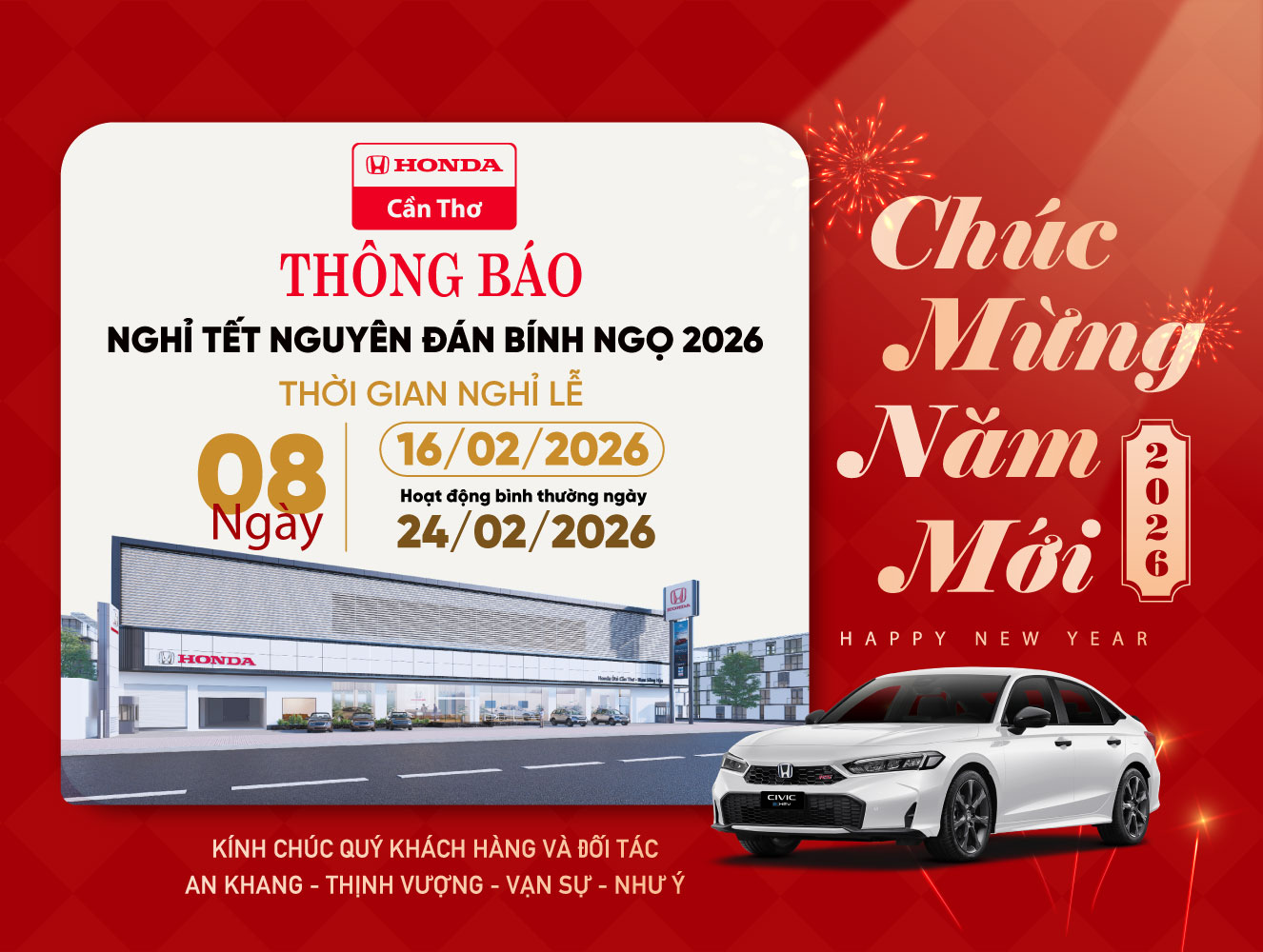 Honda Ôtô Cần Thơ xin thông báo đến Quý Khách Hàng thời gian nghỉ lễ Tết Nguyên Đán Bính Ngọ 2026, như sau: